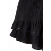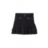 Krátká černá sukně z mačkané, tkané viskózové směsi s klasickým pasem, skrytým bočním zipem, falešnými předními kapsami a slušivými volánky.